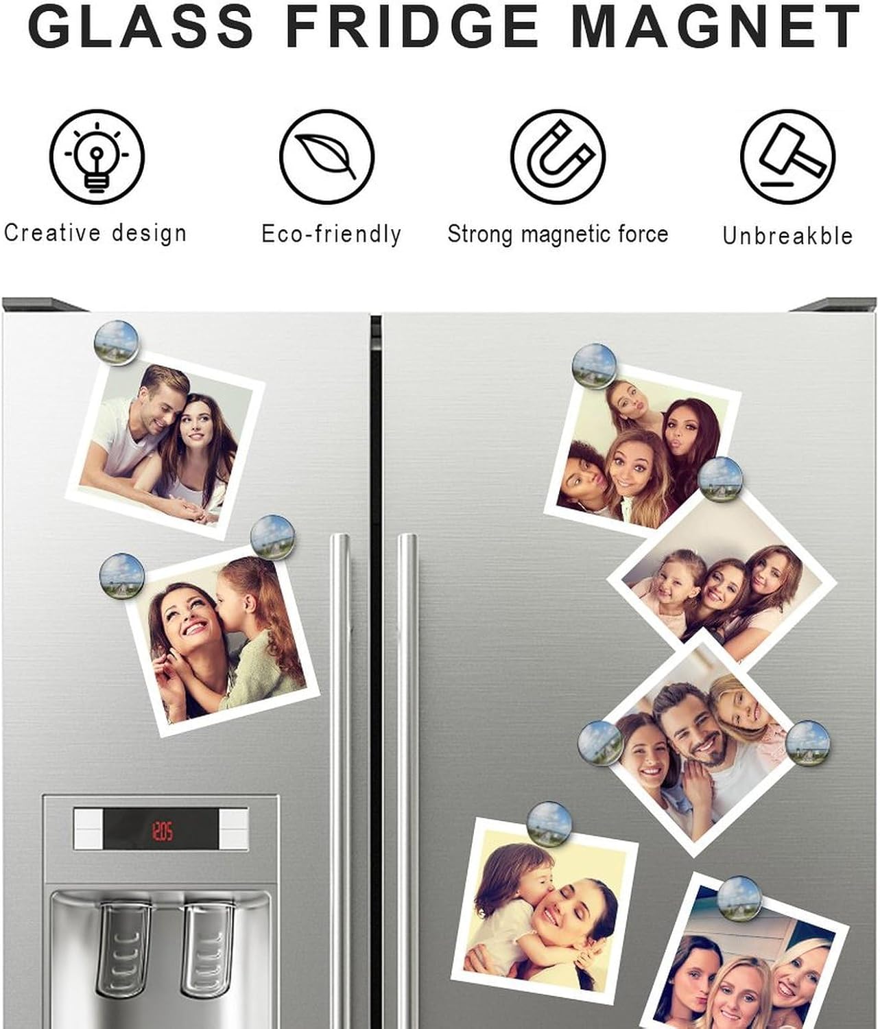 Strength Meets Graceful : Crafted from clear glass and backed with a soft rubber magnet, our fridge magnet promises to hold your memories safety, without leaving a trace on any surface. Ideal for displaying everything from precious photos to daily reminders.